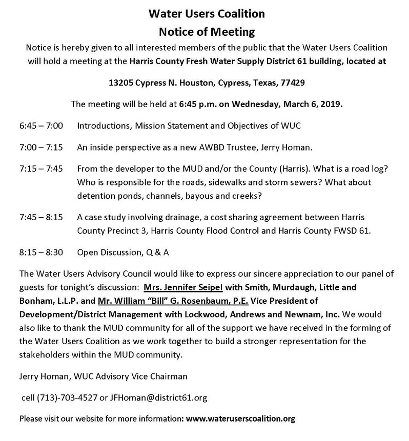 The Water Users Coalition will be having a meeting, March 6, 2019.